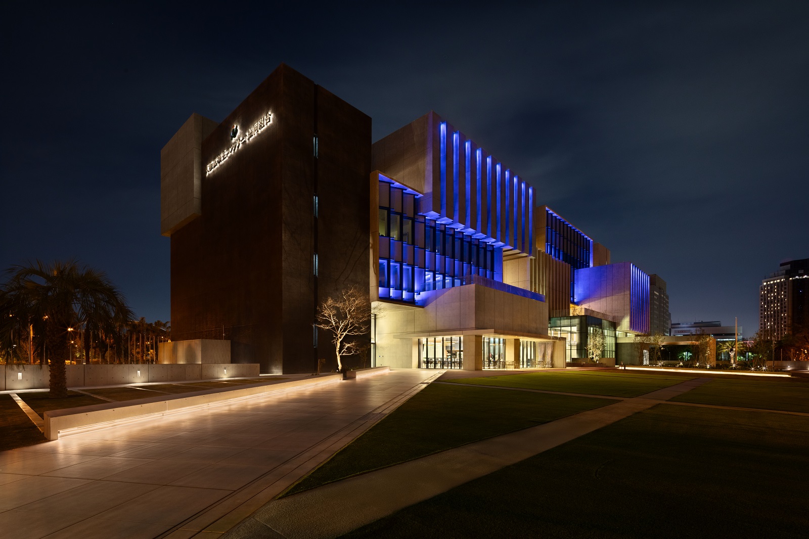 夕方を過ぎると、フルカラーLED照明による光がファサードに加わり、