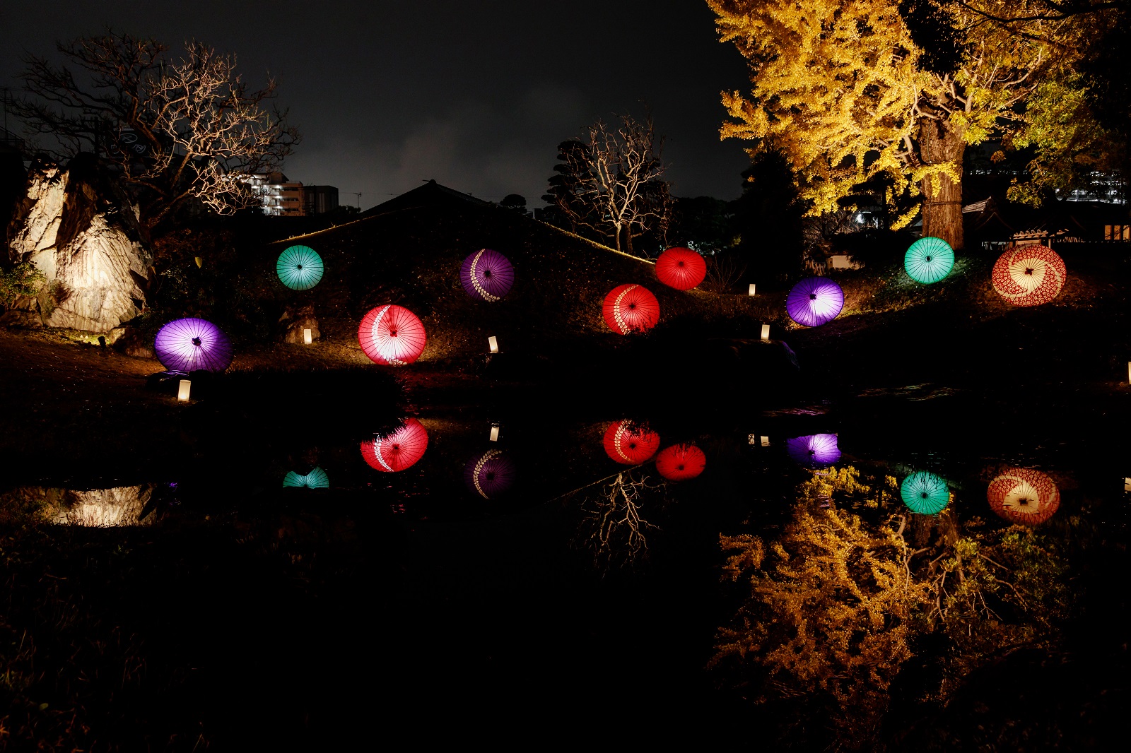 背景となるイチョウなどのライトアップと相まって、華やかな空間となりました。