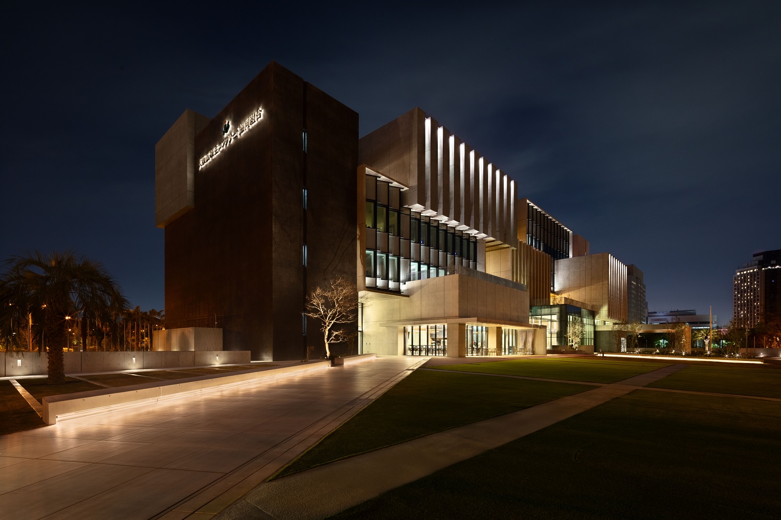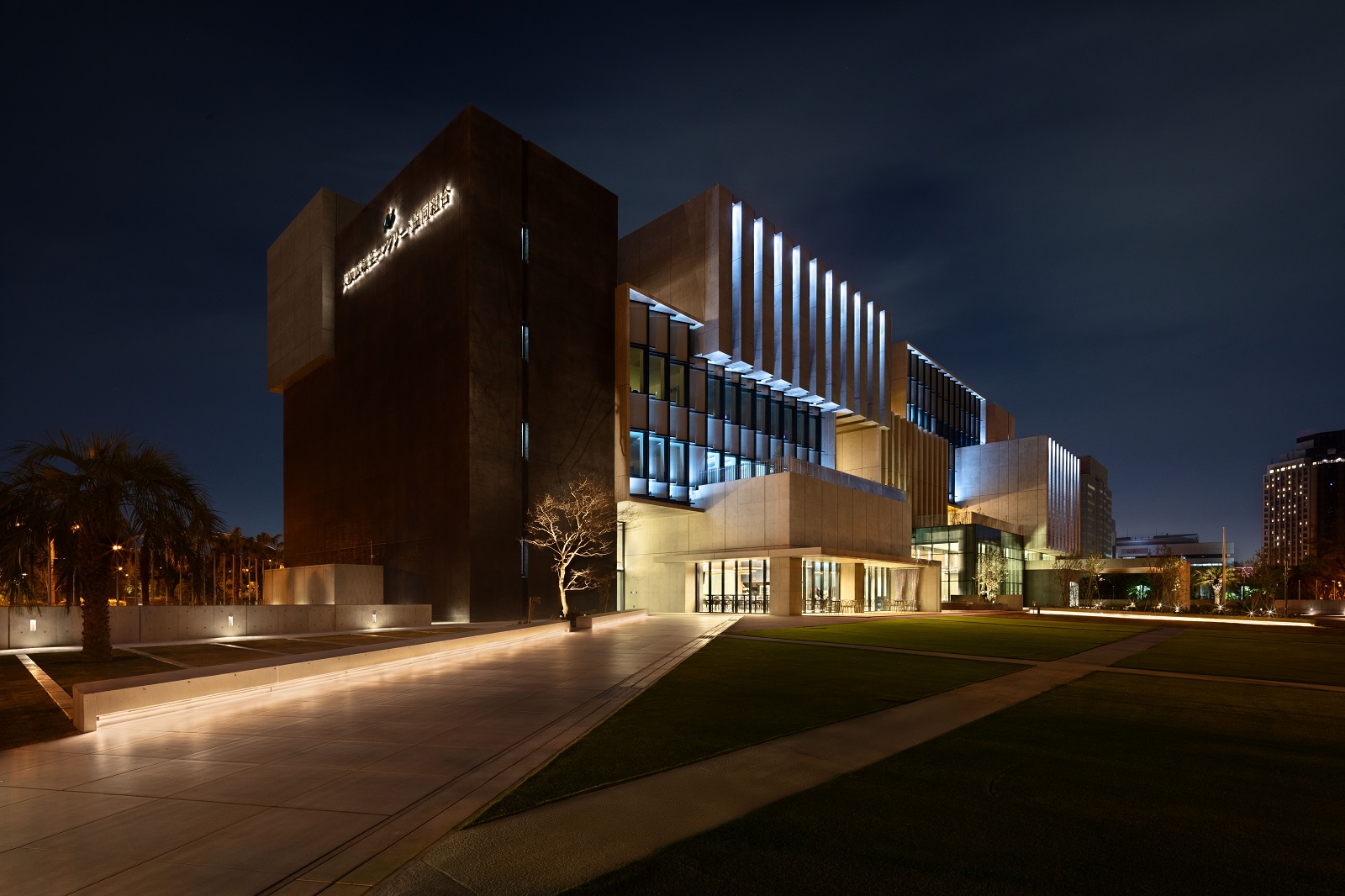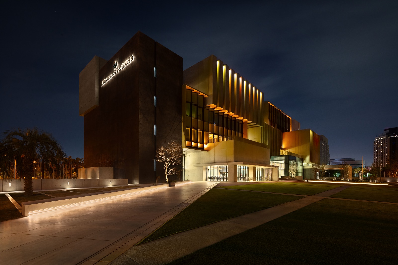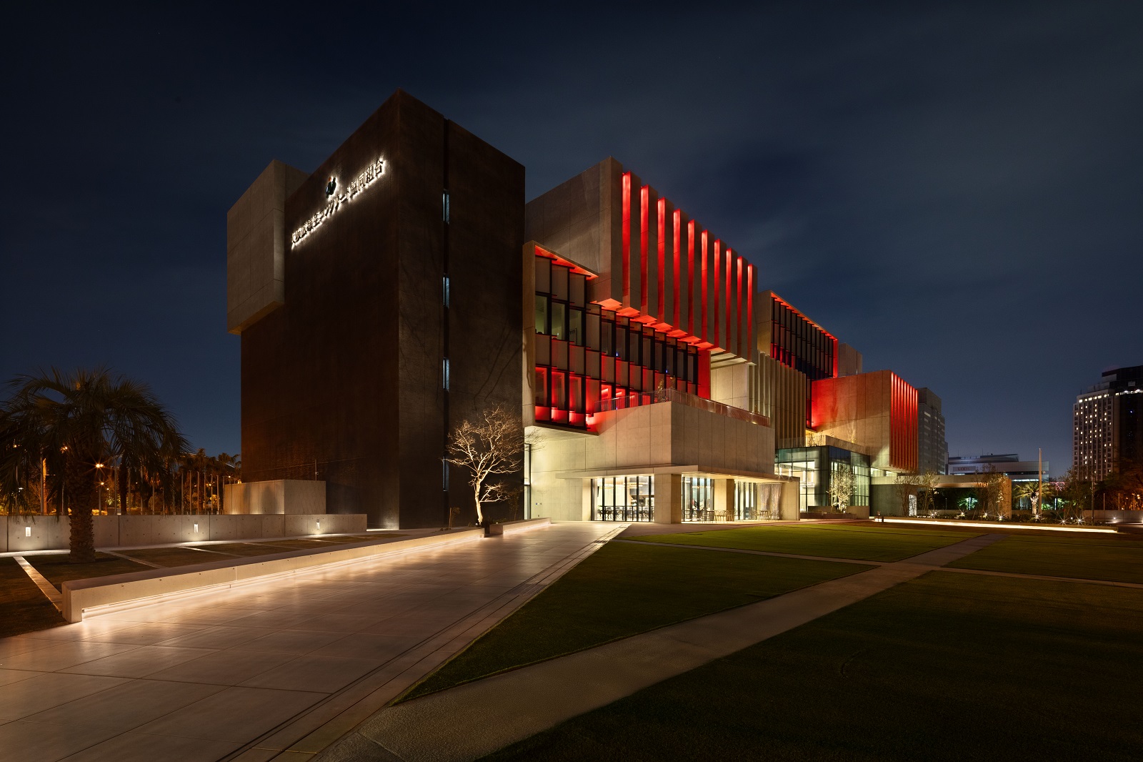 夕方を過ぎると、フルカラーLED照明による光がファサードに加わり、