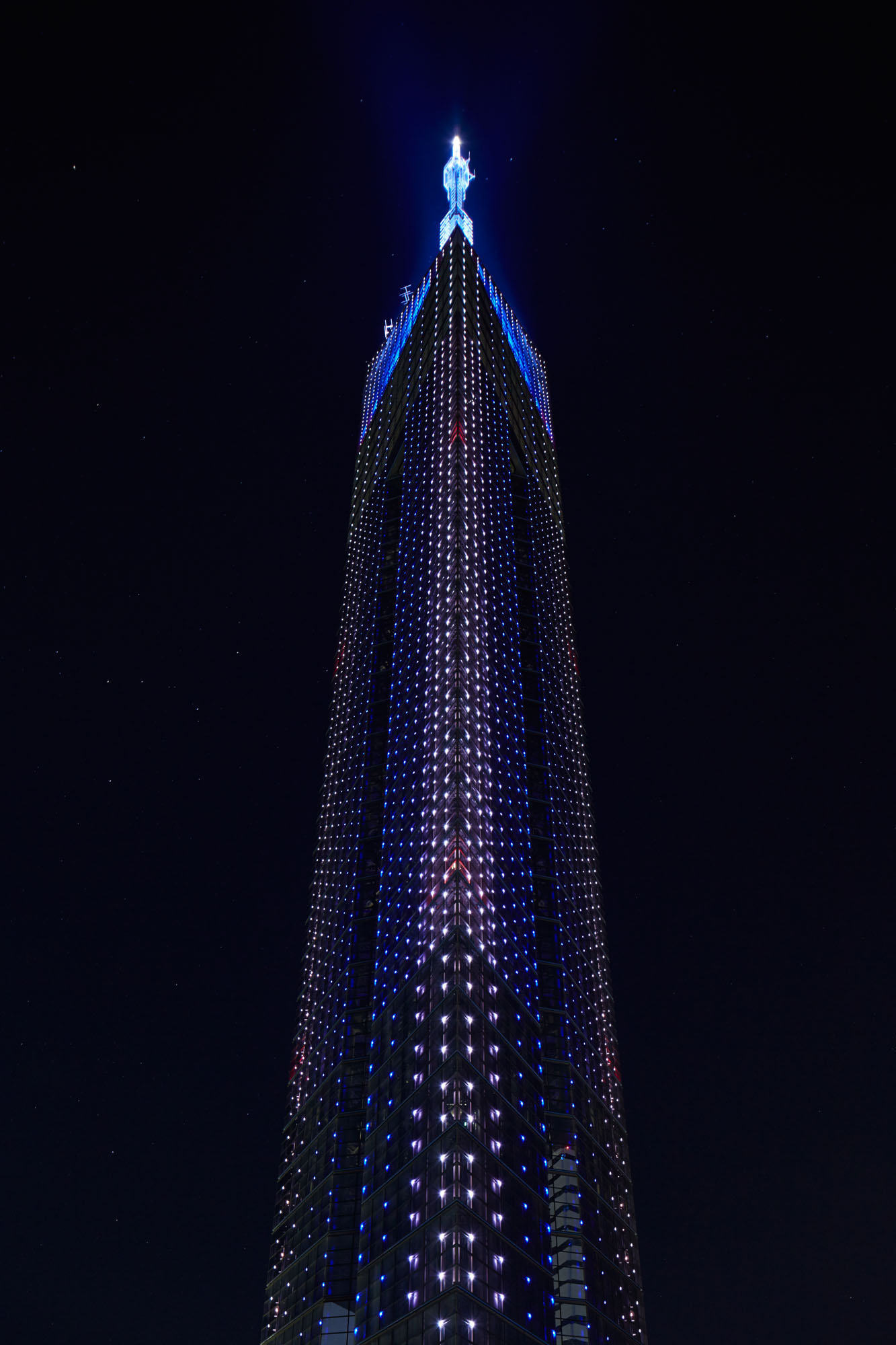 高さ234mの正三角柱の塔体はハーフミラーで覆われている。
